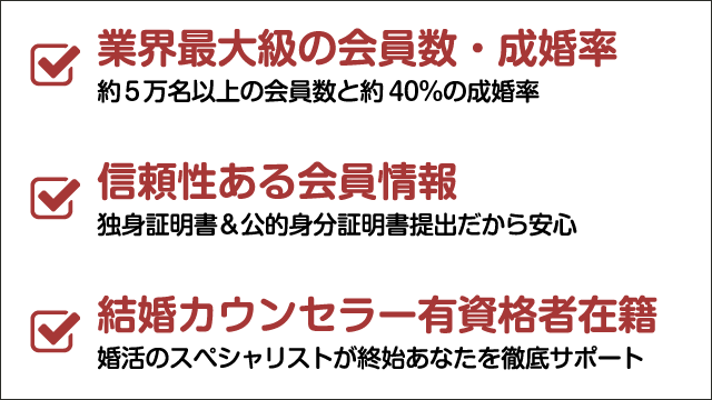 大手結婚相談サービスでは、会員数の多さや駅前に相談サロンを設けるなど、利便性に富んだ一面があります。