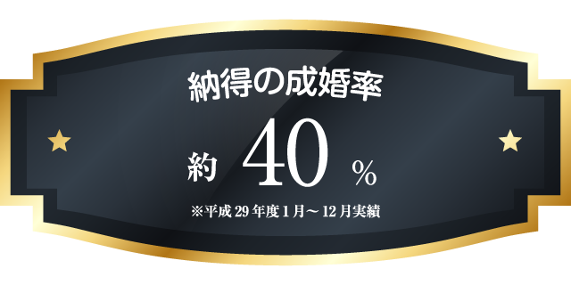 お見合いに際しては、お申込みから交際に至るまで、専任の結婚カウンセラーによる、終始徹底したサポートを心掛けております。そのため、およそ3割を超える方がお見合いから、交際に至る成果を残されています。