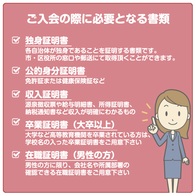 神戸婚活サービスでは、すべての会員様にこれらの書類のご提出をお願いすることで、確実性の高いお相手情報の提供と、身元確認を徹底した会員限定のシステムを、常に追求した婚活サービスを提供しております。