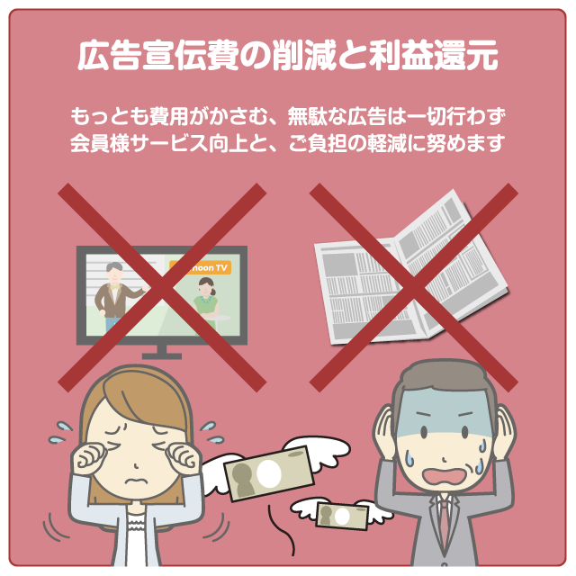 サービス業において、もっとも出費がかさむといわれる広告宣伝費。神戸婚活サービスは、当ホームページを中心に最小限の支出に止めております。大手の結婚相談サービスでは、駅前にサロンを設置したりやテレビ広告やラジオ広告などに支出を必要としており、そういった広告宣伝活動にお金をかけています。神戸婚活サービスでは、それらの費用を削減して会員サービスを充実させることを、常に実践しています。